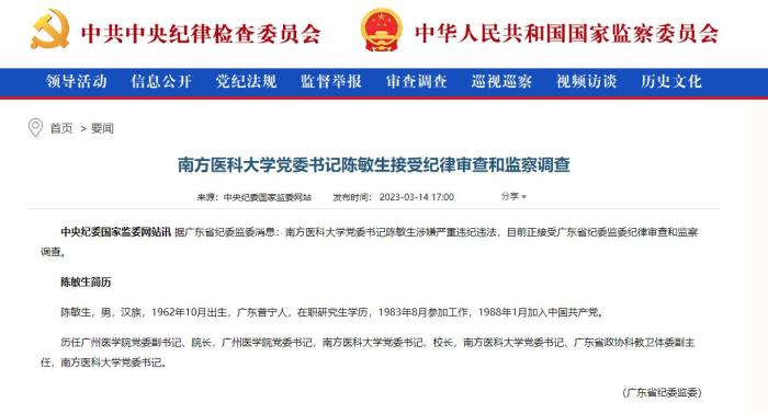 3月14日,中央纪委国家监委发布两则涉及医药卫生领域干部被查的消息,落马官员分别为南方医科大学党委书记陈敏生,广西壮族自治区医疗保障局原党组书记、局长王忠平。